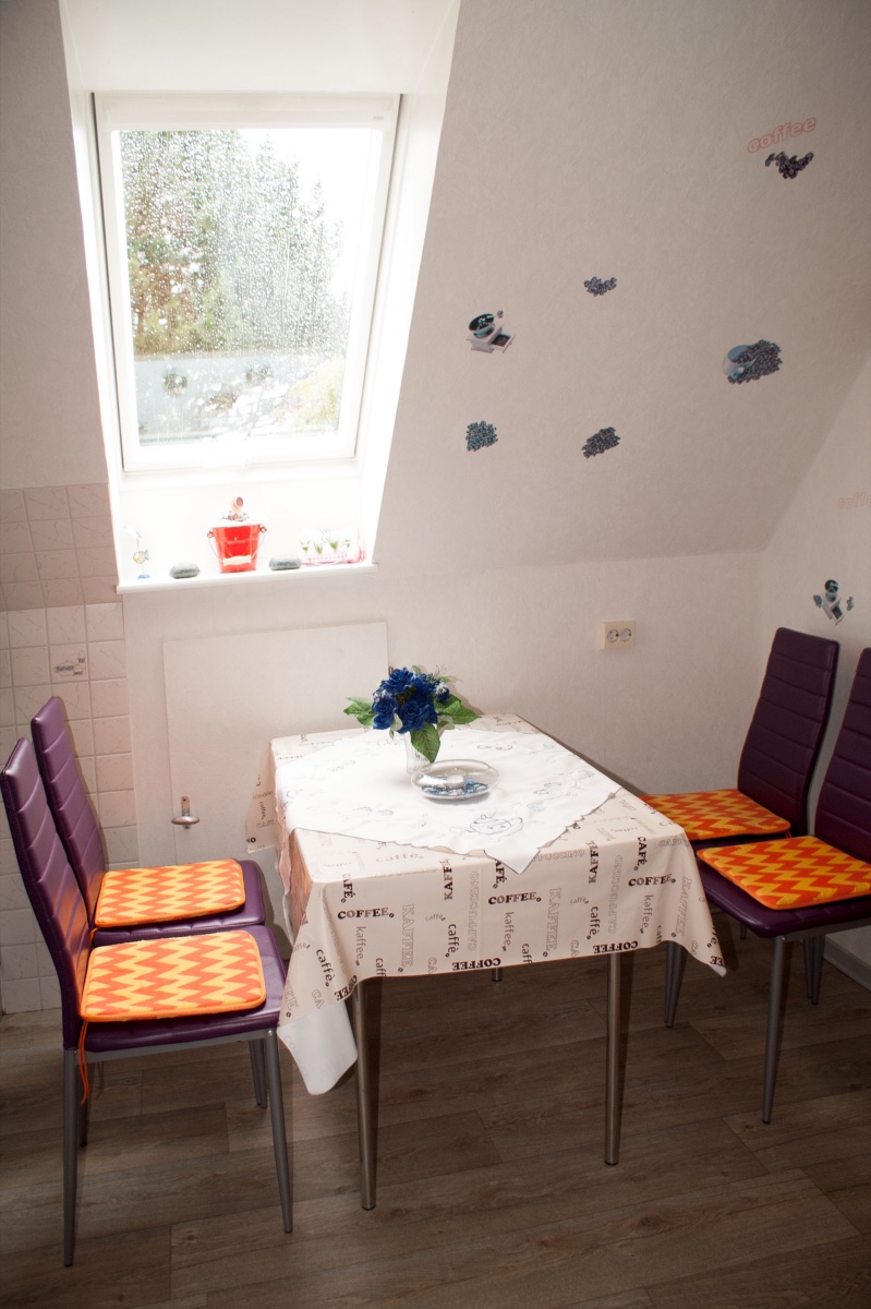 Ein Eßplatz (1 Tisch, 4 Polsterstühle) rundet die Einrichtung ab.