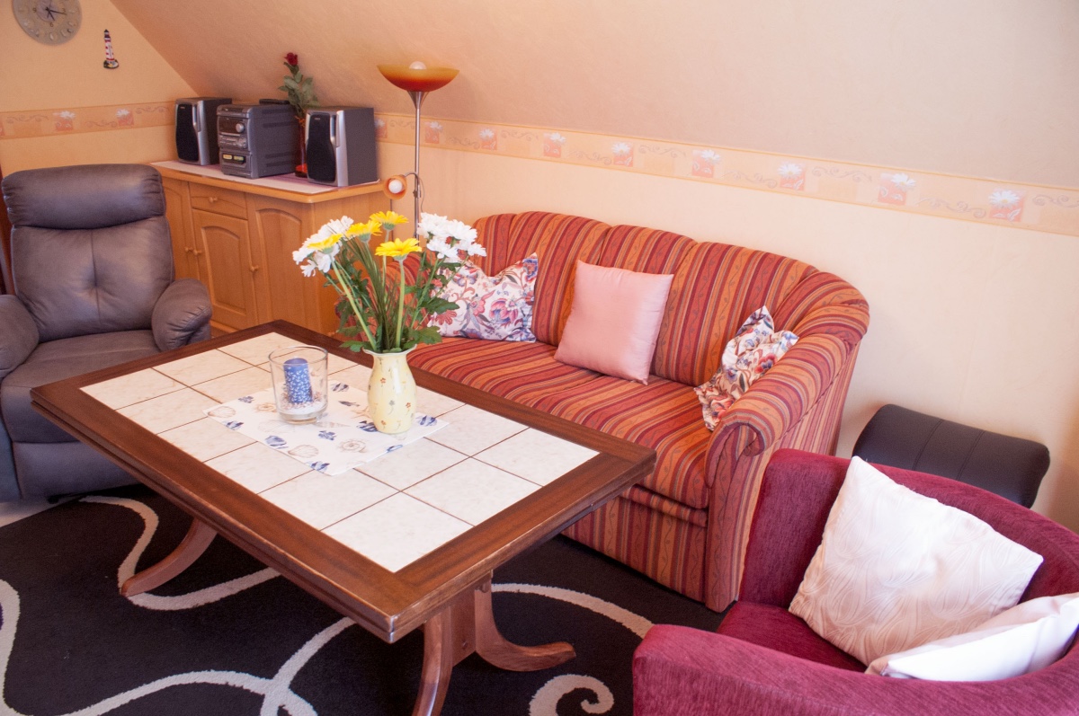 Das Wohnzimmer verfügt über eine gemütliche Sitzgruppe, einen Ausziehtisch für schöne Abende und fürs eventuelle Kaffeetrinken. Kaffeeservice befindet sich wie Gläser, Spiele, Kuchenplatten und Gabeln in einer Vitriene der Stube.