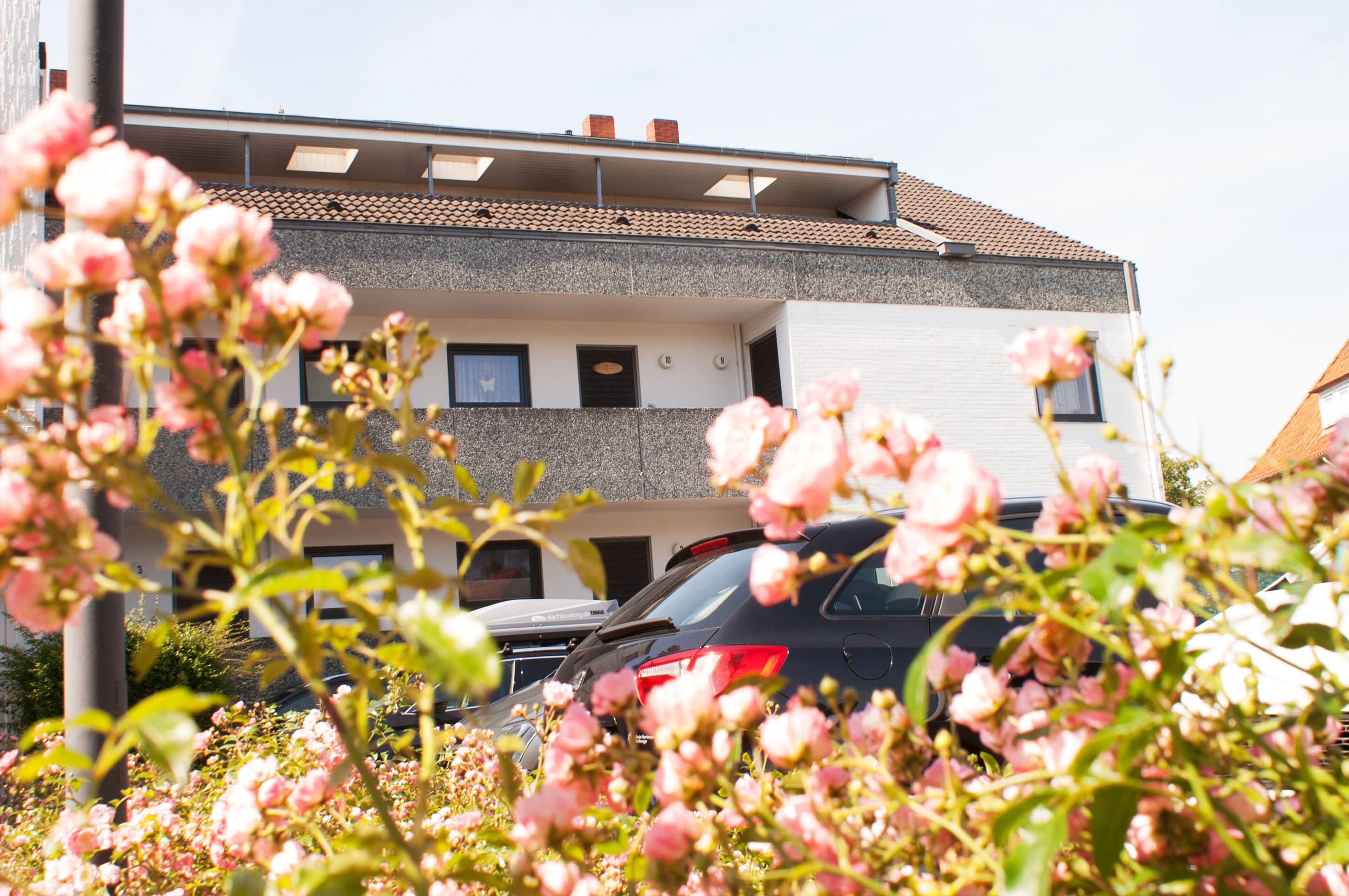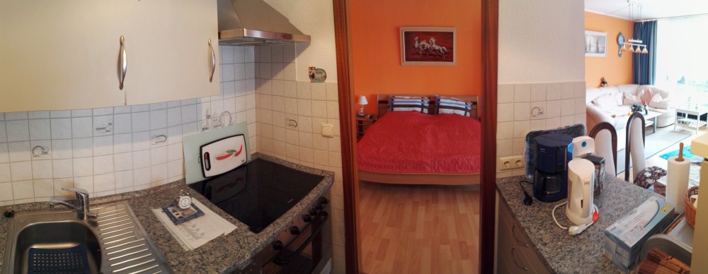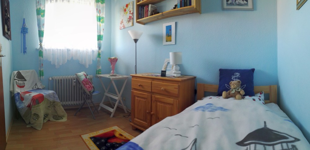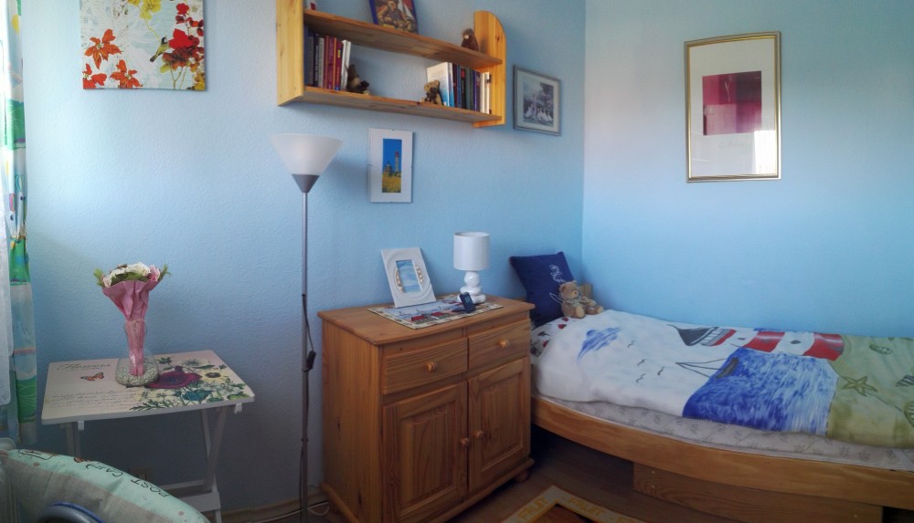 Die 53 qm Wohnung verfügt über einen kleinen Schlafraum mit einem Kieferholzbett (90 x 1,90m). Für eine weitere Person steht wahlweise ein Gästebett oder ein feststehendes Gitterbett bereit.