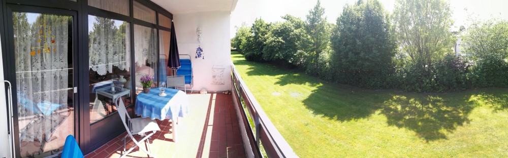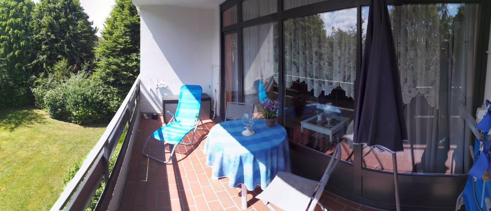 Die große Logia (9,5 m2) ist mit 2 Bäderliegen, Sonnenschirm, Tisch und vier Stühlen sowie einer Auflagebox ausgestattet. Am Abend sorgt eine seperate Lampe für ausgenehmes Licht.