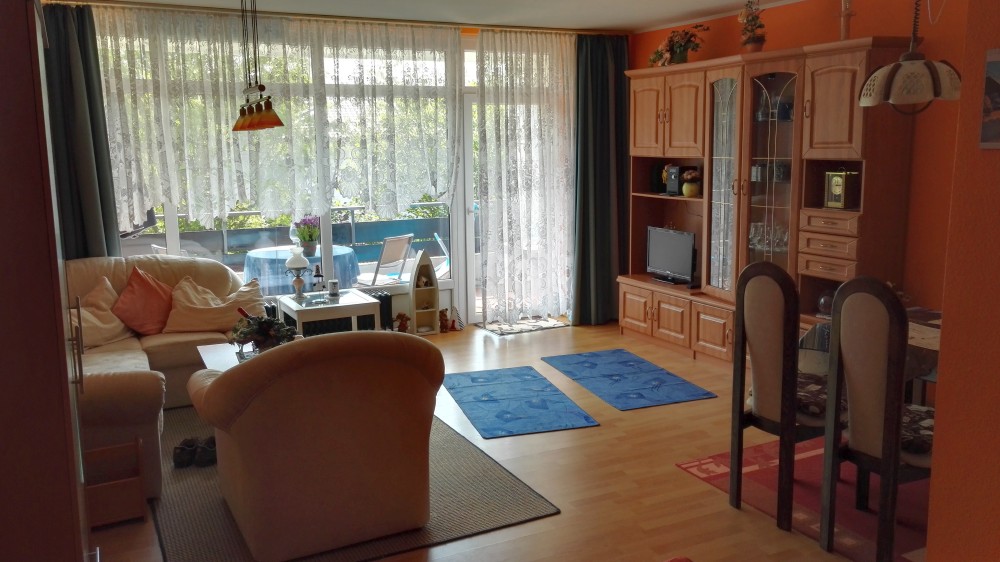 Der große Wohn- Schlafraum besteht aus einem Ehebett (1,80 x 2,00m), einer gemütlichen Sitzecke und einem Wohnzimmerschrank.